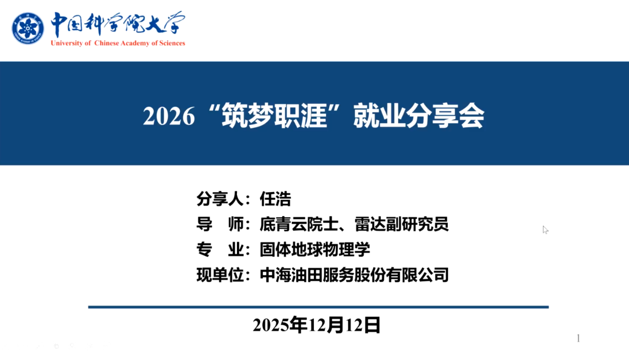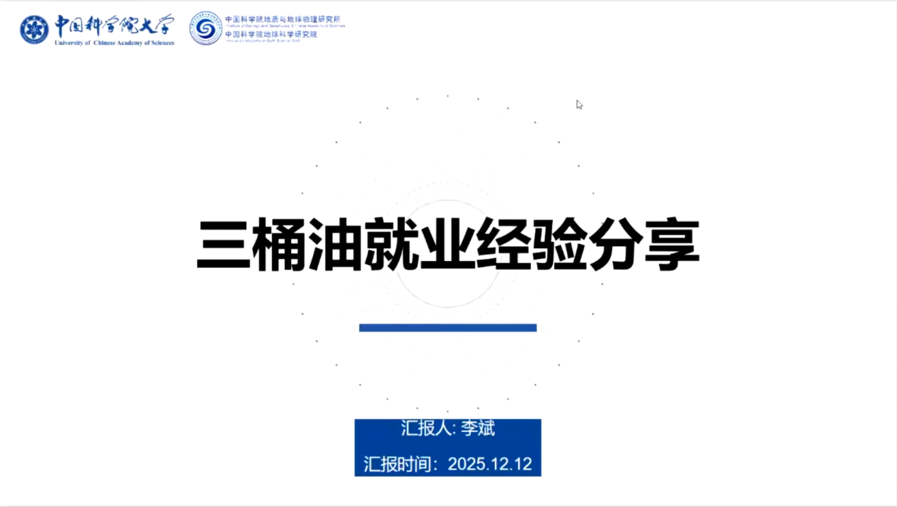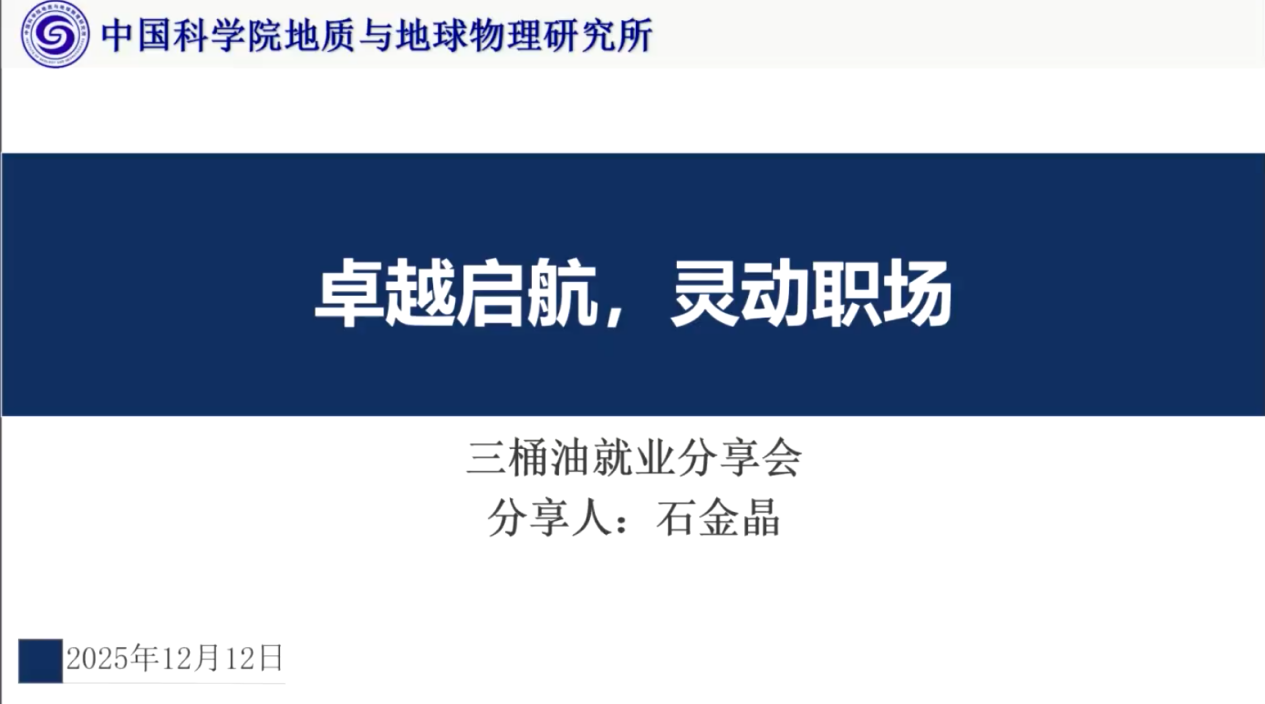 2025年12月12日,由中国科学院地质与地球物理研究所教育处、研究生会主办的第三期2026“筑梦职涯”就业系列活动顺利举行。本活动邀请6名就职于“三桶油”的优秀硕士、博士毕业生为主讲嘉宾,分享他们的就业经验,共计50余名研究生参加此次就业分享会活动。