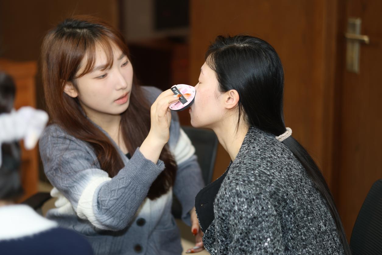 分组实操环节,每组分配一位北大新颜造型协会的助教进行指导,提供一次性粉扑、多色号粉底液、化妆棉、遮瑕膏,还有小样妆前乳、定妆喷雾等全套底妆用品。助教们手把手教学,从粉底色号的选择、取粉量到上妆手法。有基础的同学则和伙伴们互相交流技巧,分享自己平时化妆的小心得。原本素净的脸庞,在大家的巧手打造下,慢慢呈现出清透自然的底妆效果,看着镜子里的自己,同学们的脸上都露出了开心的笑容。