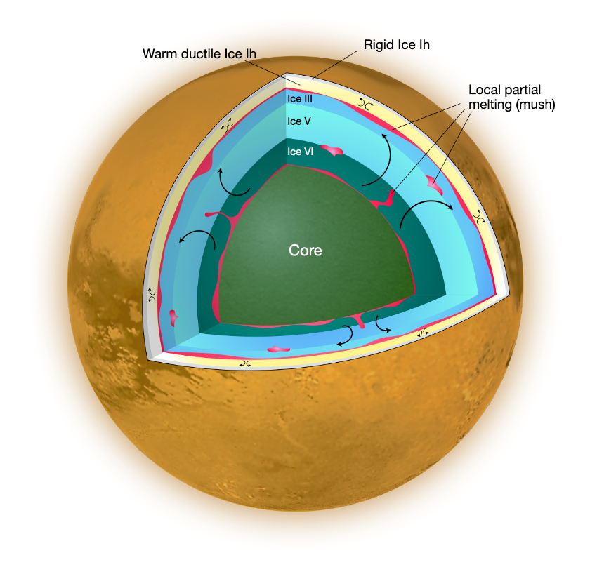 该模型中潮汐耗散主要集中发生在接近熔点并具有较低黏度的高压冰层中,这类高压冰层在潮汐频率下表现出显著的粘弹性行为,进而可以同时产生较大的形变幅度和强烈的能量耗散。虽然该模型排除了全球性地下海洋存在的情况,但却不能排除冰层内部或边界存在局部的熔融或者液态水的情况(图3)。