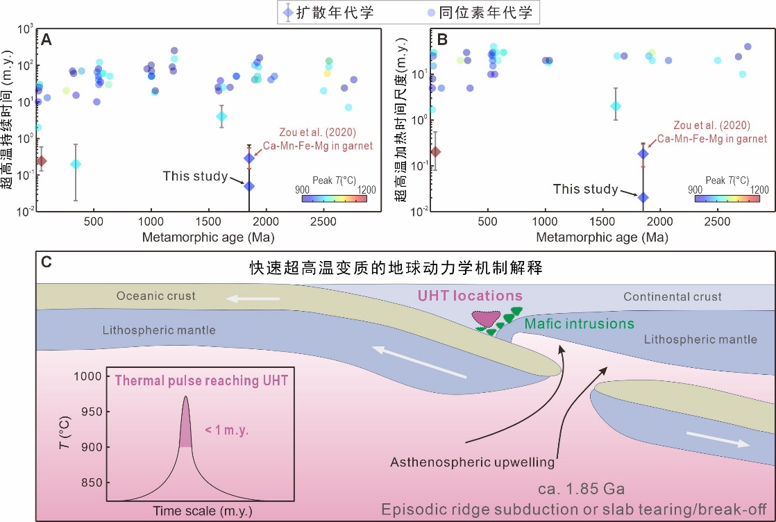 图4 (A–B)超高温持续时间和加热时间尺度随变质年龄的变化,基于扩散年代学和同位素年代学;(C)快速超高温变质的深部地球动力学机制解释