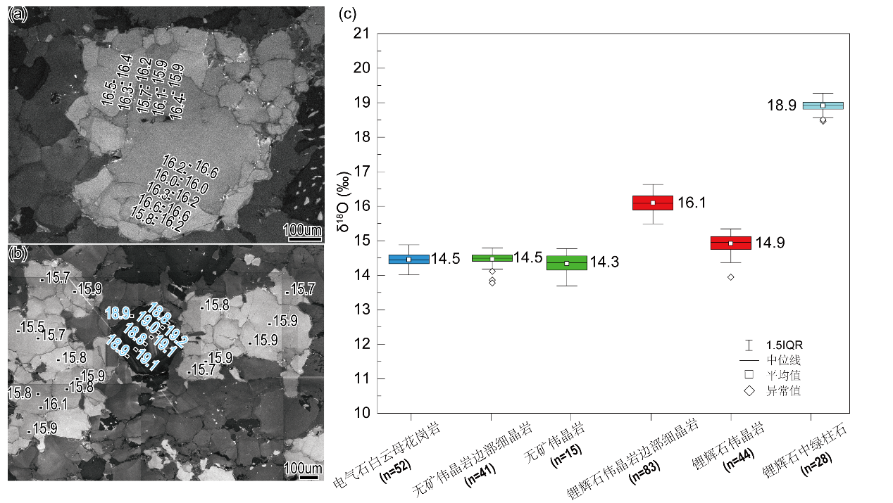 由于石英和绿柱石广泛分布于喜马拉雅花岗岩-伟晶岩体系的不同部位,保存了丰富的地质信息,其微量元素及氧同位素特征可作为示踪岩浆热液体系物质来源及岩浆-热液演化过程的有效指标。基于上述问题,中国科学院地质与地球物理研究所赵永能博士生、赵俊兴副研究员、秦克章研究员、曹明坚研究员联合澳大利亚科廷大学和中国地质大学(北京)的学者开展合作,对琼嘉岗地区不同岩相(图1;电气石白云母花岗岩、贫矿伟晶岩边部细晶岩及核部、锂辉石伟晶岩边部细晶岩及核部、日光榴石-石英脉)中石英、绿柱石开展了微量元素及氧同位素分析。研究取得的主要认识和结论如下:
