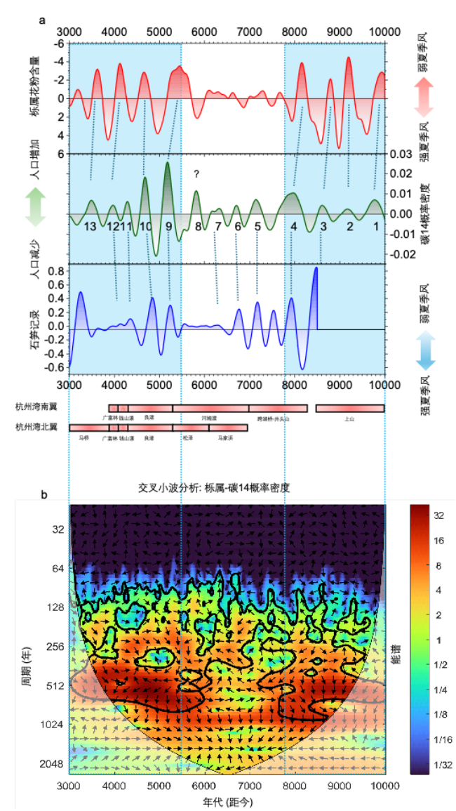 在距今一万到三千年前的长江下游地区,古人类文化和文明是如何在风云变幻的气候环境中生生不息的?近日,一项针对长江下游及邻近沿海地区的研究揭示了一个有趣的现象:该区域史前人口增减存在着一个约500年左右的周期性循环,而这一规律背后的“指挥棒”正是东亚夏季风的律动。