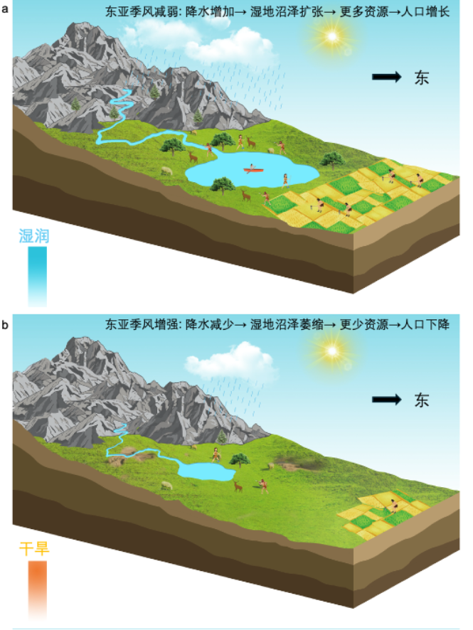 为什么会出现这种规律性的波动?答案隐藏于东亚夏季风带来的降水区域分配规律当中。研究指出,东亚夏季风对中国南北方的影响呈现一种“跷跷板”模式。当北方季风减弱、降水减少时,长江下游地区反而会迎来更充沛的雨水。在这种模式下,温润的气候扩大了湿地沼泽面积,提升了野生动植物和水稻的产量,从而支撑了人口的扩张。相反,当季风增强导致南方降水减少时,动植物生产力下降,食物资源匮乏限制了人口增长,导致人口规模收缩(图3)。