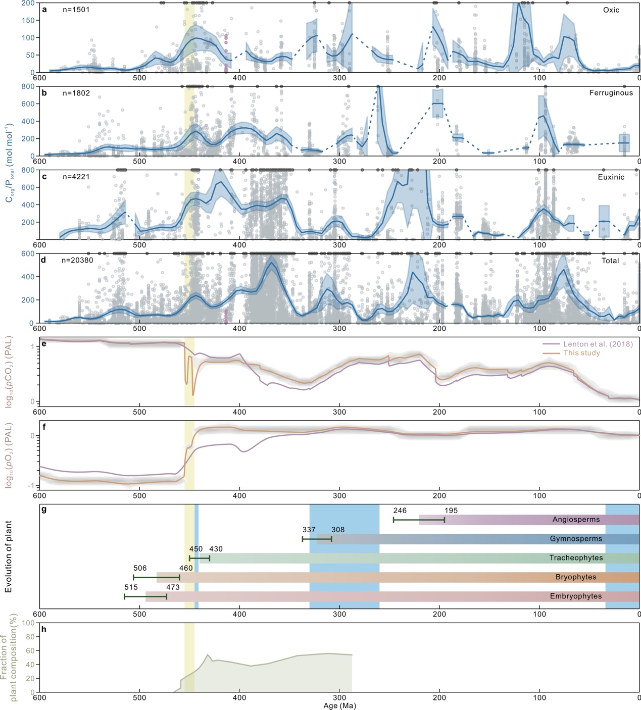 进一步分析4 .7到4.3亿年前的Corg/Ptotal变化趋势,发现Corg/Ptotal在此期间出现了两次明显升高,分别与古登堡碳同位素偏移(GICE)和赫南特碳同位素偏移事件(HICE)相吻合。这表明,富碳、贫磷的陆源有机质向海洋沉积物的输入促进了全球有机碳的埋藏,从而推动了大气氧含量的累积,并降低了二氧化碳浓度。此外,陆地植物快速扩张所引发的硅酸盐和磷风化的增强,可能进一步放大了这些环境效应。综合来看,早期陆地植物的兴起可能在驱动地球表层环境的氧化进程和气候变化中发挥了关键作用,可能促成了晚奥陶世冰期和大规模灭绝事件的发生。