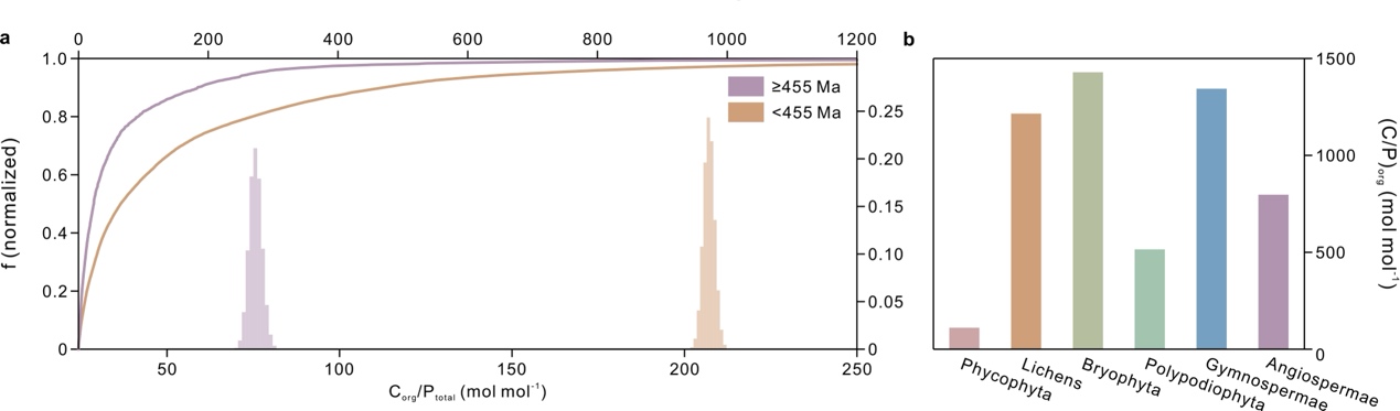 现代陆地植物和海洋浮游生物在有机碳磷比值(Corg/Porg)上存在显著差异——陆地植物通常较高(~1000–2000),而海洋浮游生物则较低(~106–250)。早期陆地植物的扩张促使更多陆源有机质进入海洋沉积物,使海洋沉积物的有机碳总磷比值升高。所以海洋沉积物的有机碳总磷比值(Corg/Ptotal)可以作为追踪陆源有机碳向海洋输入情况、进而反映陆地净初级生产力变化的重要指标。