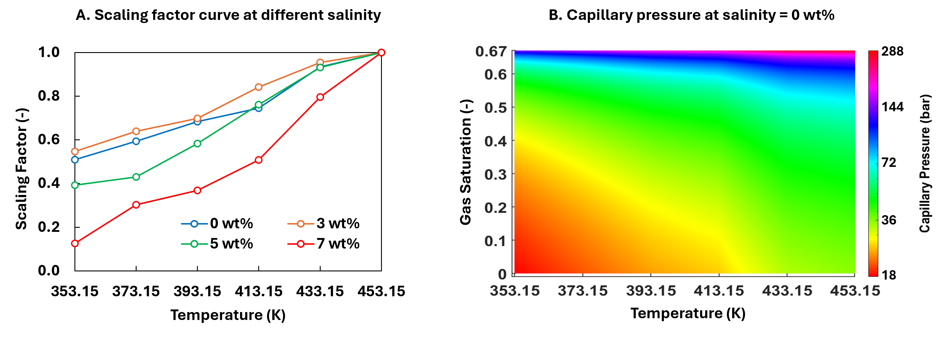 图1 根据TSPC模型计算得出的不同温度、饱和度下的缩放系数和毛管压力