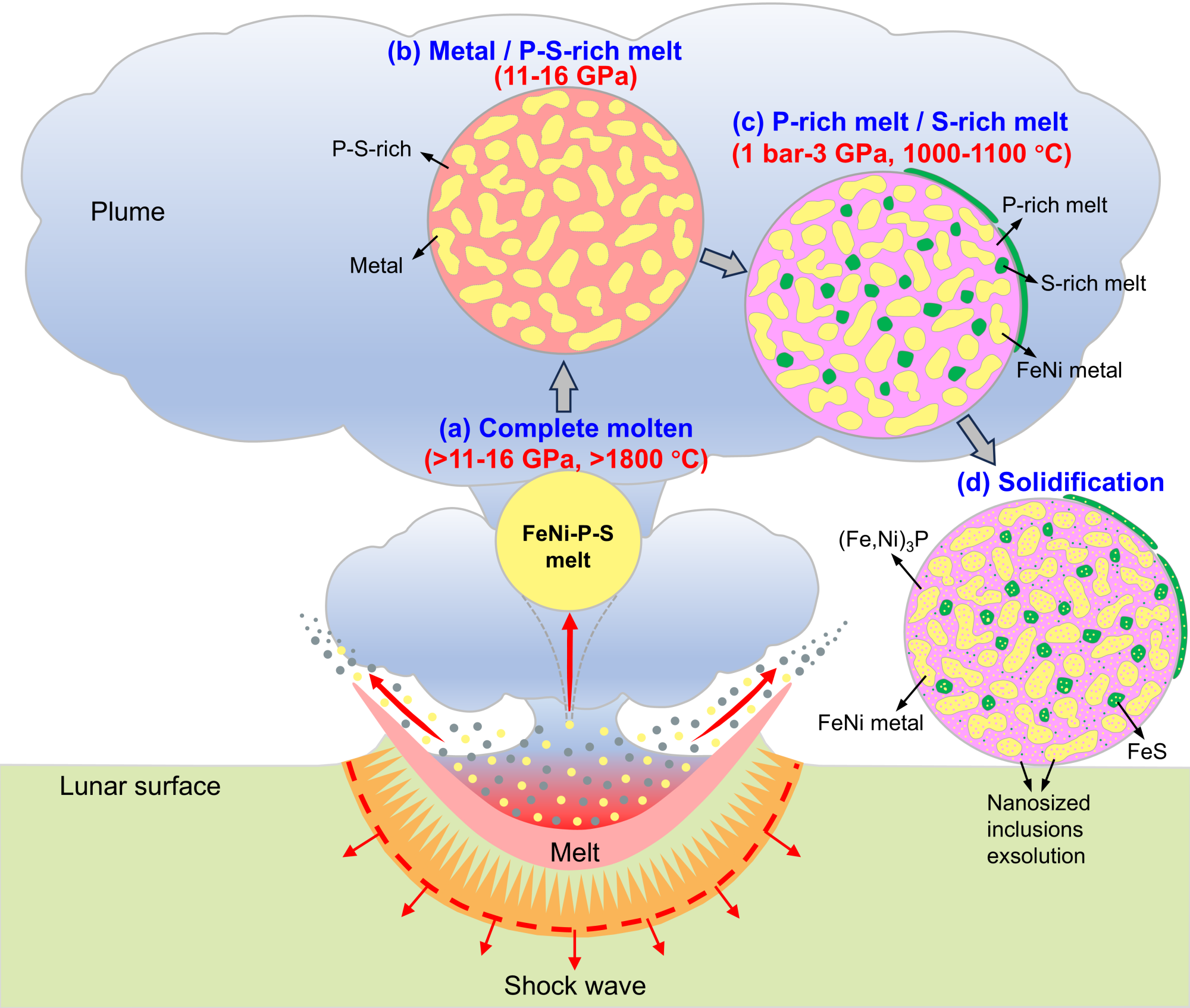 通过扫描电镜、电子探针及透射电镜等多尺度分析手段,结合Fe-P-S体系的高温高压实验,研究团队对金属熔珠进行了系统研究。其矿物组成和化学成分特征表明,该金属熔珠起源于铁陨石。在铁陨石撞击月表后,该金属熔珠在产生的云团中发生完全熔融,随后快速淬火,从而形成独特的不混溶结构。金属熔珠各相的形成与成分受控于云团内部的热温压状态。该研究的创新性研究思路在于:将金属熔珠内部不同相(FeNi金属、硫化物、磷化物)的化学成分、形态、尺寸分布视为记录其温度-压力-时间演化历史的“热力学密码”。