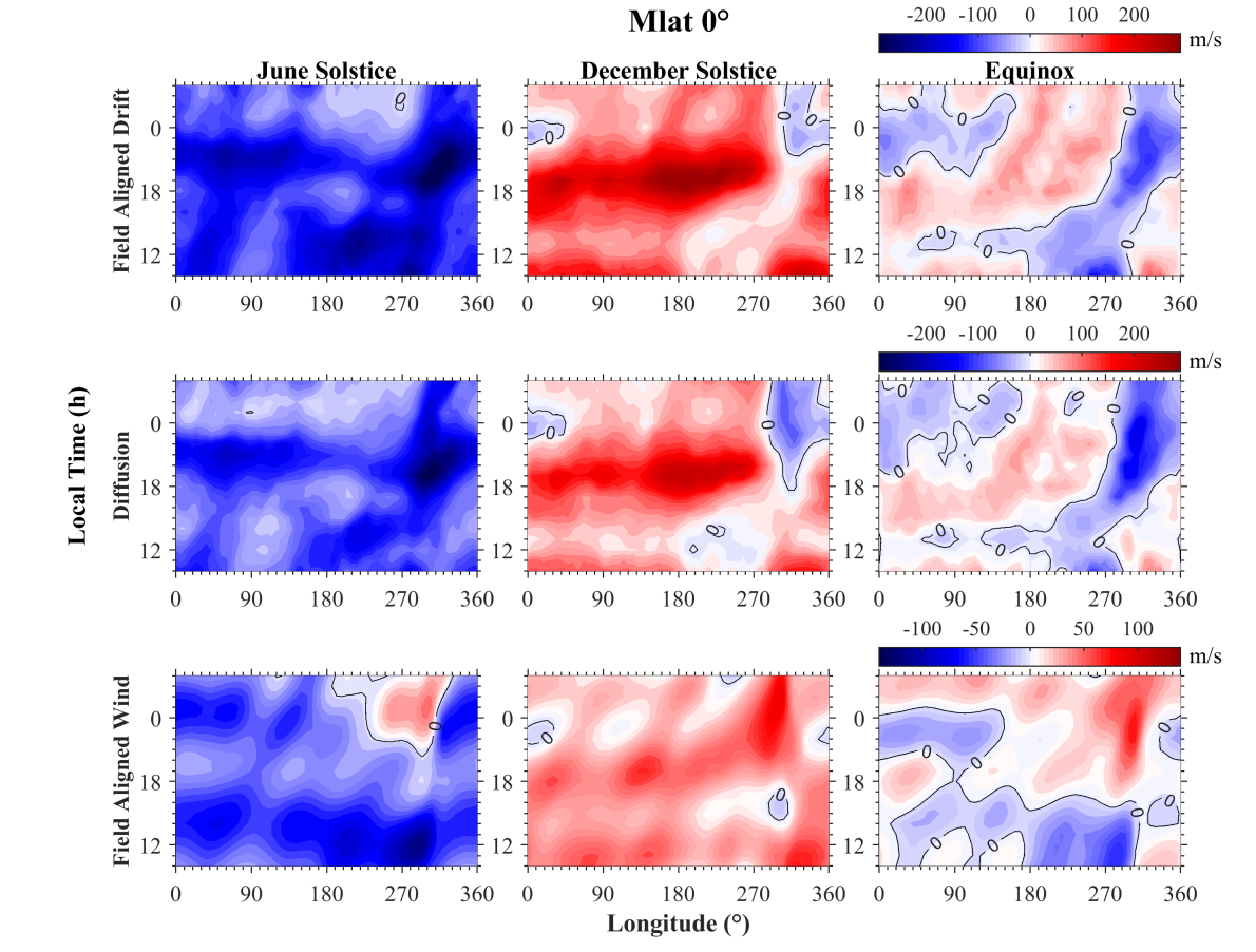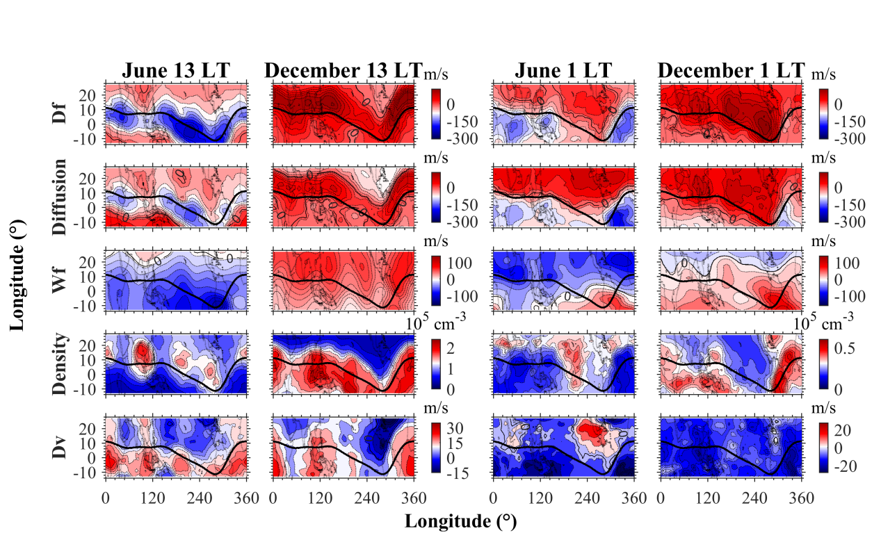 磁赤道附近区域,双极扩散表现出显著的“傍晚增强”特征,其强度峰值通常出现在日落后(图1)。该研究进一步划分了不同物理机制主导双极扩散的区域范围:在磁赤道附近,太阳辐射的不均匀性引起南北半球之间的等离子体压力差异,从而驱动了跨赤道的扩散过程;而在低纬度地区,由太阳辐射电离作用主导的垂直扩散模式占主导地位,呈现出白天向上、夜间向下的规律性日变化(图2)。观测结果同时证实,电场驱动的电离层“喷泉效应”对双极扩散具有调制作用,不仅增强了冬季半球侧的跨赤道等离子体输运强度,还塑造了沿经度方向的结构。