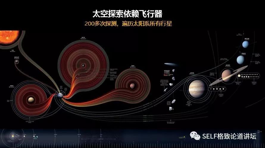 图中的每一条线都代表一次探测。在这200多次探测中,我们探测最多的是月球,有80多次,其次是金星和火星。太阳系的每一颗行星我们都探测过,当然,最感兴趣的还是火星。