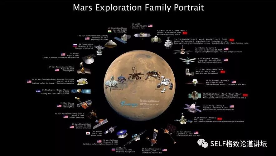画在火星上的这些叫着陆器或者火星车,大概有6个。画在火星周围一圈的是轨道器,是在天上飞的。