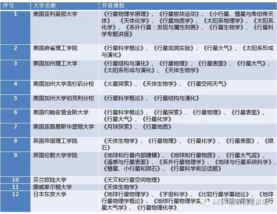 这张表列举了美国的一些知名大学,比如哈佛大学、麻省理工大学、约翰霍普金斯大学,它们都有相应的地球与行星科学系,每一个系都开设了非常丰富的行星科学课程。