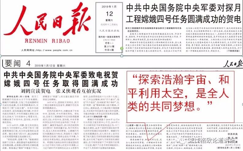 这是2019年1月12日,嫦娥四号成功登陆月球背面之后,中共中央发来的一封贺电,贺电里写道:“探索浩瀚宇宙、和平利用太空,是全人类的共同梦想。”