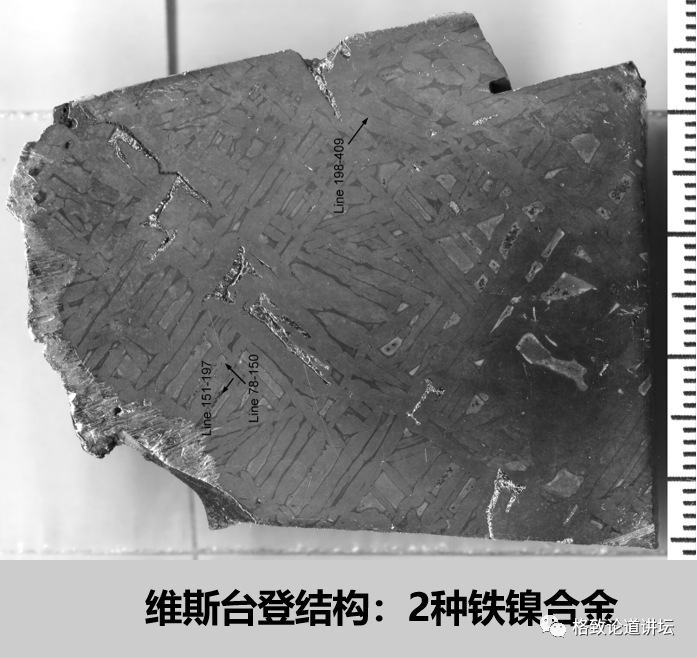 如果从铁陨石上切割下来一块并打磨抛光,然后用很稀的酸来腐蚀表面,会产生不均一的花纹。