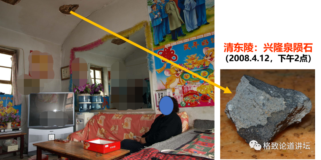 2008年,在北京距清东陵约3km的一个叫兴隆泉的小村庄,也发生了一次陨石坠落事件。这间房子的女主人离开沙发没多久,一个陨石直接砸穿房顶,打到沙发上,最后弹到床上。陨石在镜子上还留下擦痕,陨石碎裂成几块,总重约3kg。