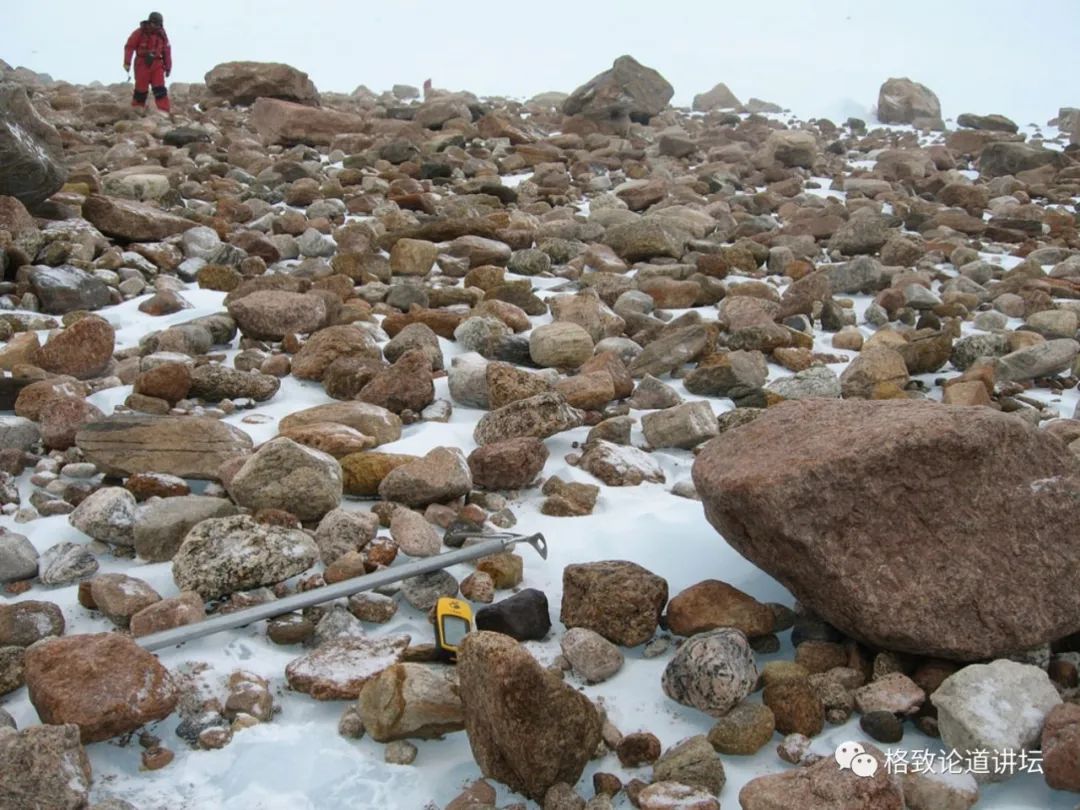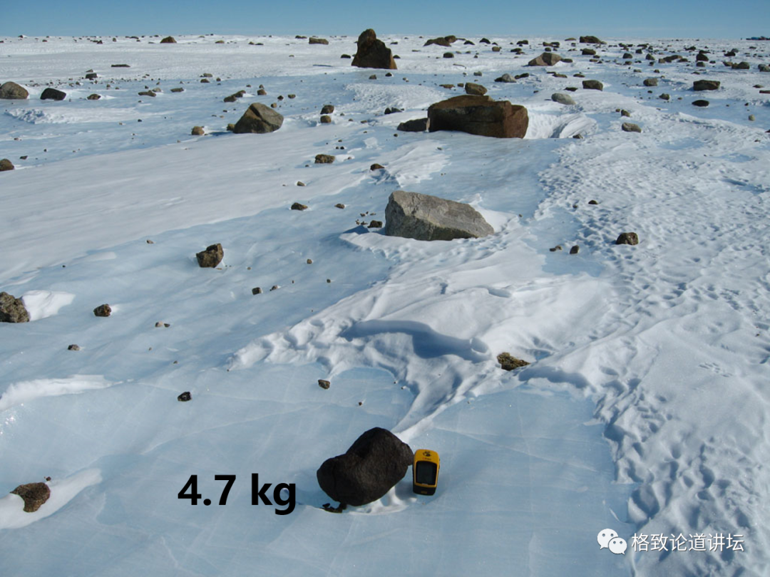 南极格罗夫山地区的地表是蓝盈盈的冰面,部分表面覆盖着雪,陨石在这个背景下是非常显眼的,所以很好找。