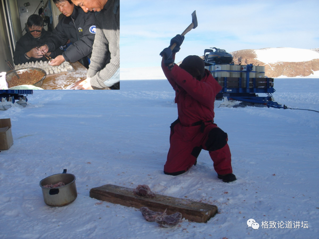 在南极生活的主要问题是没有青菜吃,猪肉、牛肉、羊肉都冻得硬邦邦的,需要用斧砍。