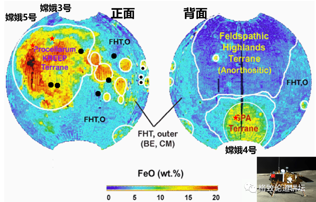 月球正面、背面的氧化铁含量分布图。黑点符号表示阿波罗号和月球号着陆点