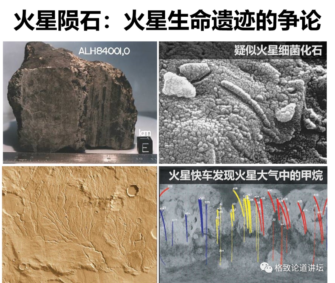 很多人认为火星上有生命。1996年,美国NASA科学家还声称,在这块ALH 84001的火星陨石中找到生命存在的证据,并引发争论。现在基本认为之前的证据或是地球上的污染、或是样品制备过程人为产生的。