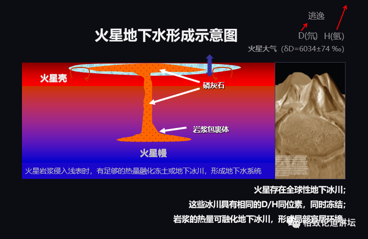我们说火星以前有水,但现在表面上没有流动的水,因此有一部分水是逃进太空了。逃走的水越多,留下水的就越重,即D/H比值越大。因此,测出火星地下水的D/H比值很重要。