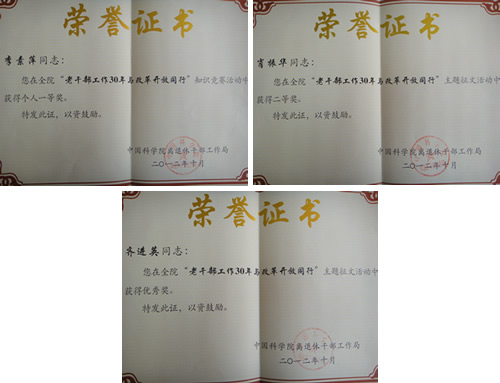 中国科学院2012年 “老干部工作30年与改革开放同行”主题征文活动及知识竞赛活动结束了,在这次活动中,我所离退休办公室工作人员李素萍同志获得知识竞赛个人一等奖。离休干部肖振华同志获主题征文活动二等奖,齐进英同志获主题征文活动优秀奖。