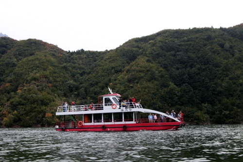 下午大家来到雾灵湖景区,雾灵湖在密云县新城子镇,湖的东面紧靠雾灵山(海拔2118米)。水库虽然不大,但据说湖水很深,呈现出美丽的蓝绿色;由于周围都是群山环抱,湖面出奇的宁静,就如同镶嵌在群山之中的宝石。水库周围环境绿化非常好,山谷中不时有鸟鸣,让人感觉安静祥和,大家在湖中乘坐游船和快艇,在游船上欣赏四周美丽的风景,快艇上享受动感和刺激。大家都十分快乐和尽兴!
