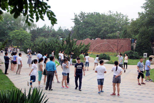 赛前各参赛队都提前来到比赛现场进行热身练习,小月河边湿润的空气、绿色葱郁的植物交织着运动的场景形成一道独特的风景。两点整随着苏军老师的一声哨响,比赛正式开始,由各分工会组成的12支参赛队开始了“2分钟10人8字”跳绳比赛。根据比赛规则分成6组,抽签到一组的两支参赛队同时进行比赛,按照大排队的方式决出前三名。赛前,各分工会组成的参赛队伍利用早晨和中午的时间在所里有限的场地进行了认真的训练,楼前楼后都可以看到大家锻炼的场面。