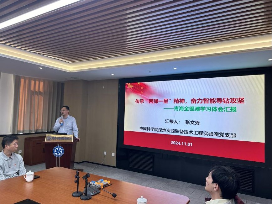 下午座谈会上,李守定领学习近平总书记在接见探月工程嫦娥六号任务参研参试人员代表时发表的重要讲话》,姚洁领学新华社采访侯建国院长的访谈稿—《奋力抢占科技制高点 助力科技强国建设》。张文秀作《传承“两弹一星”精神,奋力智能导钻攻坚》专题党课。一幅幅场景图片、一个个生动故事,带领大家走进了金银滩草原上,回顾了老一辈科技工作者凭着钢铁般的意志自力更生、艰苦奋斗,成功完成原子弹和氢弹的研制,使中国跻身世界核大国行列,让中华民族挺起脊梁的丰功伟绩。