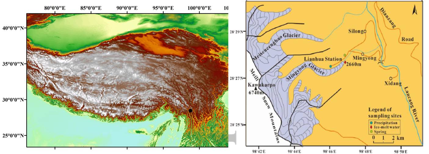 青藏高原是亚洲水塔,其冰川水资源关系到数十亿人口用水。在近几十年来气温显著升高的影响下,冰川消融强烈。青藏高原的梅里雪山的明永冰川末端仅有2600 m,是横断山脉海拔最低的冰川之一(图1),区域内降水季节性差异显著,为降水和冰川融水补给地下水机理研究提供了绝佳条件。