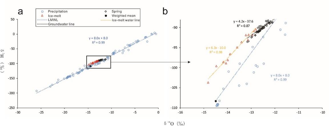 考虑到明永冰川区季风降水和非季风降水同位素信号差异显著,他们又将补给地下水的降水细分为非季风降水和季风降水。将冰川融水线与降水线相交发现,交点的同位素值与非季风降水同位素平均值十分相近,结合前人的气象学研究结果,可以认定,明永冰川主要积累于非季风降水。因此,将冰川融水对地下水的补给看作非季风降水对地下水的补给之后,可以得出结论认为:87%±28%的地下水补给来自非季风期的降水,也就是说,尽管非季风期降水量小于季风期降水量,但它主导了地下水补给过程。