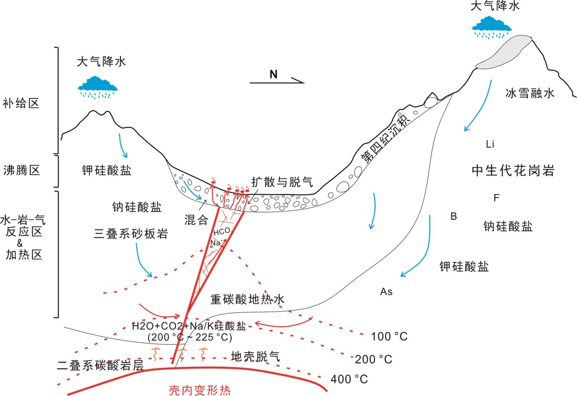 高温地热流体由于经历了强烈的水岩相互作用或受到岩浆挥发分的影响,通常具有高矿化度的流体地球化学特征,且地热水呈Cl-Na型、SO4-Na型。然而,在喜马拉雅东...
