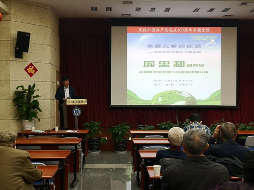 庞忠和从在习近平新时代中国特色社会主义理论指导下,落实作为国家重要战略科技力量的职责和使命,开发地热资源、助力碳中和讲起,详细介绍了我国地热能源特点和我国地热利用产业的概况,进而提出地热未来技术与产业展望,其中穿插研究团队协同奋进、为国争光的故事及个人感悟。主题党课以党带领科技工作者开拓创新、攻坚克难为主线,循序渐进,引人入胜,再现了四代地热科技工作者响应国家号召、面向国家能源变革的重大需求,艰苦奋斗、协同创新的历史进程。