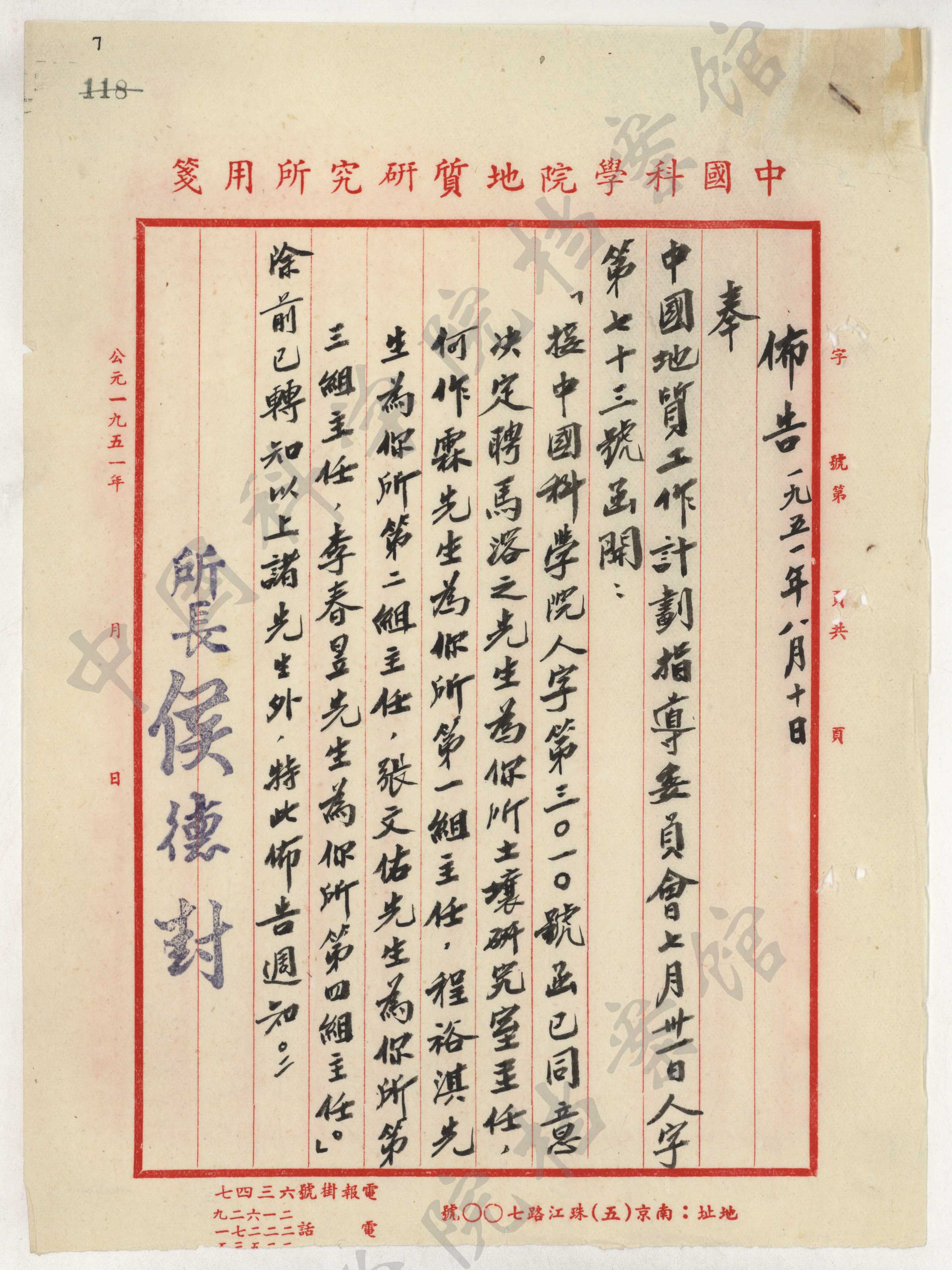 1950年8月25日,中央人民政府政务院第47次政务会议同意李四光提出的全国地质工作统一管理方案,设立“一会、两所、一局”,成立了中国科学院地质研究所,任命程裕淇、张文佑为地质研究所副所长,8月29日政务院致文化教育委员会的函“同意侯德封代理地质研究所所长”。