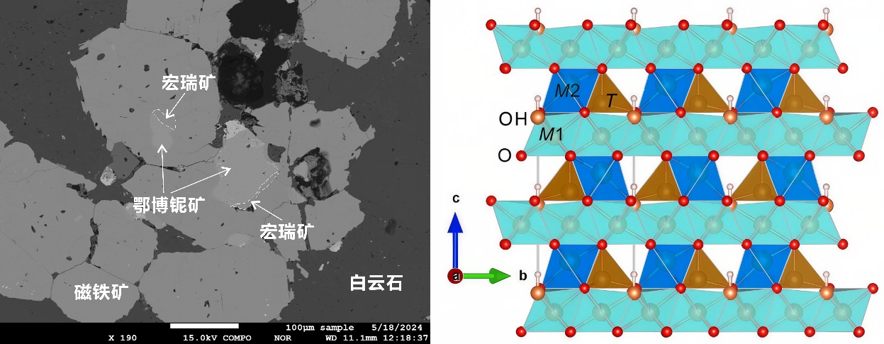 宏瑞矿产于白云鄂博矿床碳酸岩脉中,呈红褐色,玻璃光泽,板状,粒度约10~30 μm,密度为4.453 g/cm3,通常与鄂博铌矿、烧绿石、磁铁矿和白云石等矿物共生。该矿物属于铁钒矿超族,是一种以镁、铁和铌为主要组分的氧化物矿物,且含羟基水。Nb2O5平均含量32.8 wt.%,化学式为(Mg2Fe3+)NbFe3+O7(OH),六方晶系,空间群 P63mc(#186)。