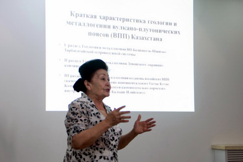 在学术交流会上,Eleonora Seitmuratora教授作了题为 “Stratigraphy, granitoids and associated ore deposits of the Balkhash metallogenic belt, Kazakhstan”的学术报告。她首先对东哈萨克斯坦的区域地质概况作了介绍,并着重将波谢库尔-麦卡因地区与成吉思-塔尔巴哈台地区进行了对比。接着她对东哈萨克斯坦地区泥盆纪地层特征进行了详尽的介绍,并对该区岛弧及火山构造进行了着重介绍。最后,Eleonora Seitmuratora教授对东哈萨克斯坦地区石炭系-二叠系地层进行了系统的梳理,并详细介绍了她所做的该区101个剖面并对该区火山岩做了剖析。针对我国新疆地区与哈萨克斯坦地区区域对接问题,Eleonora Seitmuratora教授给出了自己的看法和建议,并对东哈萨克地区斑岩成矿的潜力做出了评价。
