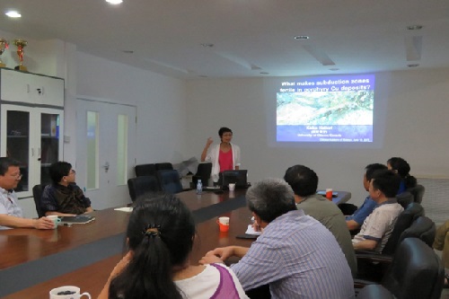 在学术交流会上,Kéiko Hattori教授作了题为“What makes subduction zones fertile in porphyry Cu deposits? ”的学术报告。她从浅部长英质岩浆含矿、多期岩浆注入,氧化性岩浆岩等方面进行了深入细致的讲解,认为高硫的碳酸盐岩围岩、挤压-伸展转换构造作用、高氧逸度岩浆、成熟岛弧俯冲带产生的幔源氧化性岩浆,是俯冲带富集斑岩型铜矿的必不可少的条件。并列举了环太平洋和特提斯成矿域的多个典型实例进行了分析。