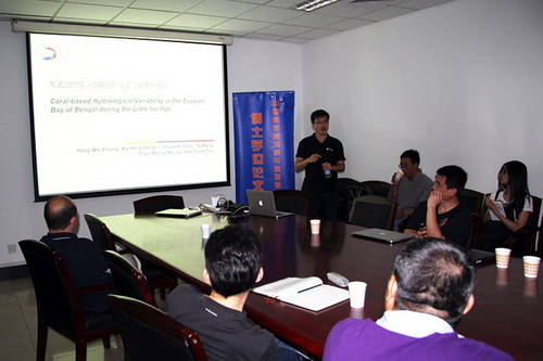 姜宏伟介绍了缅甸西海岸珊瑚的氧同位素研究成果:1)18世纪中期珊瑚化石的氧同位素值比现生珊瑚大约1‰;2)线性回归分析表明,现生珊瑚氧同位素值与海水盐度呈显著正相关,与海面温度的相关性远低于海水盐度;3)小冰期,珊瑚氧同位素值增大,这意味着该时段印度季风减弱,从而导致孟加拉湾的淡水注入显著减少。