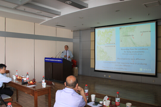 随后,Kenji SUGIMORRI(杉森贤司)教授作了题为“Microorganisms living in extreme environments and their effective utilization for human health”的学术报告。他详细介绍了研究工作地质背景、采样情况,分析了在各种极端环境下发育的微生物种类、数量、赋存特征,重点阐述了微生物在人类治疗皮肤病、关节炎及心血管等疾病中的应用。另外还介绍了微生物在环境污染修复及石油开采中的应用。