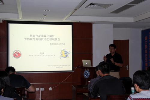 9月10日,美国加州理工学院地质与行星科学系岳汉博士应构造物理学科组邀请访问我所特提斯研究中心,同多位研究人员就大地震破裂过程的最新研究进展进行了深入的讨论。岳汉博士作了题为“Toward resolving stable high-resolution kinematic rupture models of large earthquakes by joint inversion of seismic, geodetic and tsunami observations. ”的学术报告,详细介绍了他针对全世界各地强震震源破裂过程所开展的联合反演研究工作的最新进展,并探讨了宽频带地震波、连续GPS和InSAR等大地测量技术、及海啸波等多种数据对地震破裂过程反演的不同时间和空间分辨率约束。来自不同研究室的众多老师和同学同岳汉博士进行了深入细致的讨论和交流。