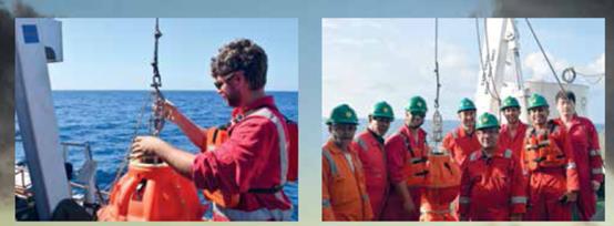 左:Tim Greenfield在投放OBS之前检查仪器情况。 右:部分科学人员与最后一台即将投放的OBS合影。