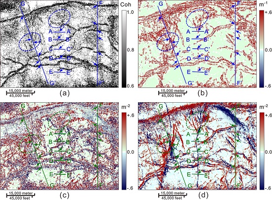 图2 断裂刻画对比(a)相干体;(b)曲率;(c)、(d)曲率变化率
