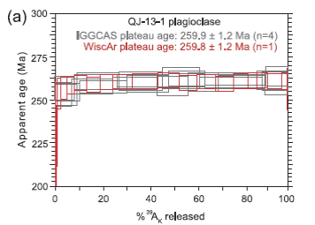 40Ar/39Ar年龄谱,灰色为我所稀有气体实验室,红色为美国威斯康星大学实验室。两者精度均达到0.5%,年龄相差0.04%,表明地时-中国40Ar/39Ar定年技术已经达到EarthTime核心实验室水平