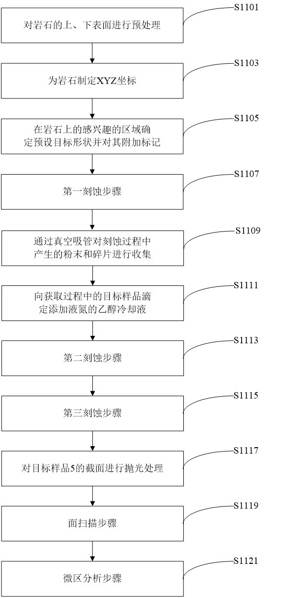 本发明的技术效果:(1)本发明的微区取样方法是对岩石的感兴趣区域进行基于目标位置的微区块体取样,不会破坏原岩的整体结构。基于此,本发明能够依据原岩的组织结构、生长环带等特征设定对应于目标位置的取样形状。(2)本发明通过附加有液氮的乙醇冷却液,能够有效地对目标样品进行降温和清洗。(3)按照本发明的方法获取的目标样品,既能够对其XOY面进行原位显微表征,还能够对其XOZ和YOZ截面进行显微分析,这是传统的空心钻取样法所不具备的。