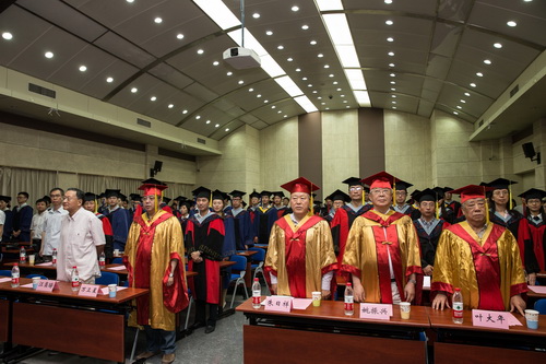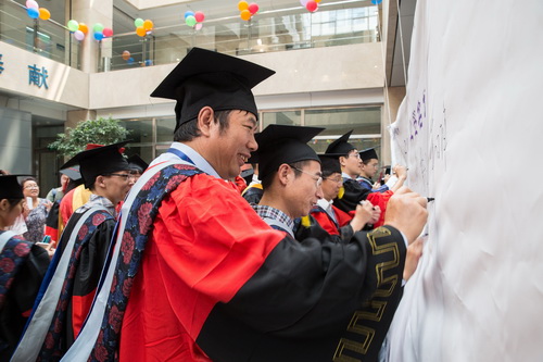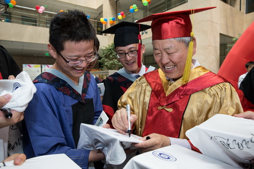 最后,全体毕业生与所领导、参加典礼的学位委员会委员、导师集体合影,并在毕业签名墙、纪念衫上签名留念,将毕业典礼活动推向高潮。(摄影任晖)
