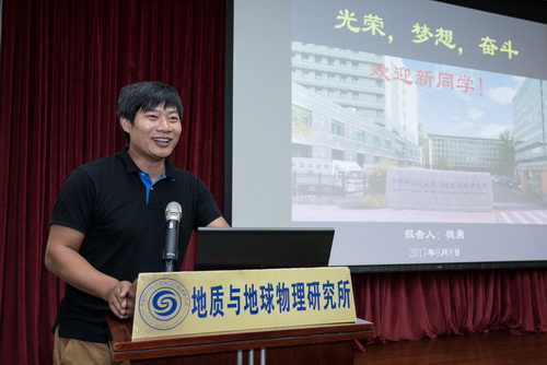 魏勇代表研究所致辞欢迎2017级新生,以“光荣,梦想,奋斗”为主题,详细介绍了研究所的发展历程、人才队伍、科研水平、学术贡献以及未来的发展前景,鼓励同学们心怀梦想,并不断努力奋斗,尽早适应研究所的学习和科研工作节奏,融入到研究所浓郁的科研氛围中,真正成为研究所的一员。