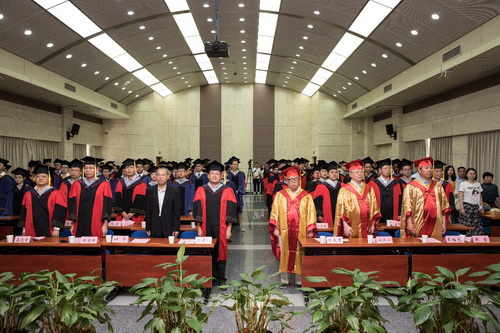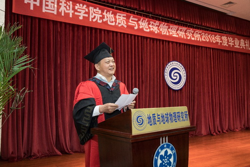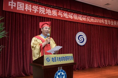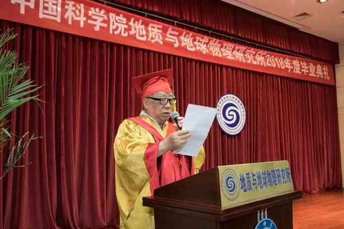 典礼在庄严的国歌声中开始。学位委员会主任叶大年院士首先宣读了《中国科学院地质与地球物理研究所学位委员会2018年夏季学位授予决定》,建议授予栾晓东等79名同学博士学位,授予刘建光等35名同学硕士学位。