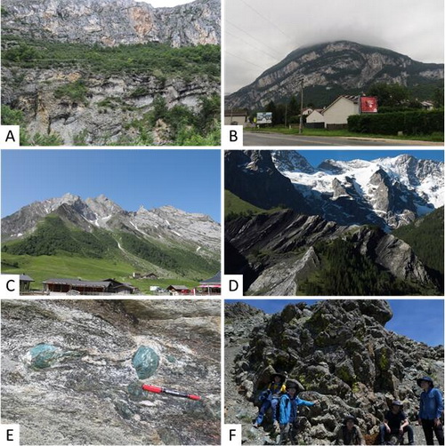 [A. Urgonian(K12)灰岩中发育的不和谐褶皱;B. Sassenage褶皱,前陆褶冲带(外带)的典型代表;C. Bellonne结晶基底之上的Dauphinois zone沉积岩,整体构成向斜构造;D. La Grave逆冲推覆构造单元:结晶基底逆冲到早中侏罗世黑色页岩之上;E. Settimo Vittone,Seisia Zone的榴辉岩,围岩为云母片岩;F. Chenaillet蛇绿混杂岩中的枕状玄武岩]