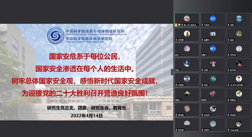 2022年4月15日是《中华人民共和国国家安全法》实施后的第七个全民国家安全教育日。为增强研究生维护国家安全的使命感与责任感,树立国家安全意识,我所研究生党总支、团委、研究生会、教育处于4月14日晚上19:00通过线上会议方式,紧扣第七个全民国家安全教育日“树牢总体国家安全观,感悟新时代国家安全成就,为迎接党的二十大胜利召开营造良好氛围”主题,开展了专题学习。各研究生党支部委员、研究生会成员、团支部书记、班长等学生干部参加会议。
