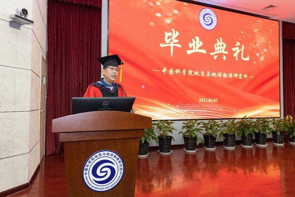 2023届博士毕业生张驰代表毕业生发言。他回顾了在研究所学习、生活的难忘经历,也表达了对研究所、导师、同学、亲友的感恩之情,并勉励全体毕业生要坚定科研初心,为国家发展、民族复兴、科技进步贡献属于地质地球所学子的力量!