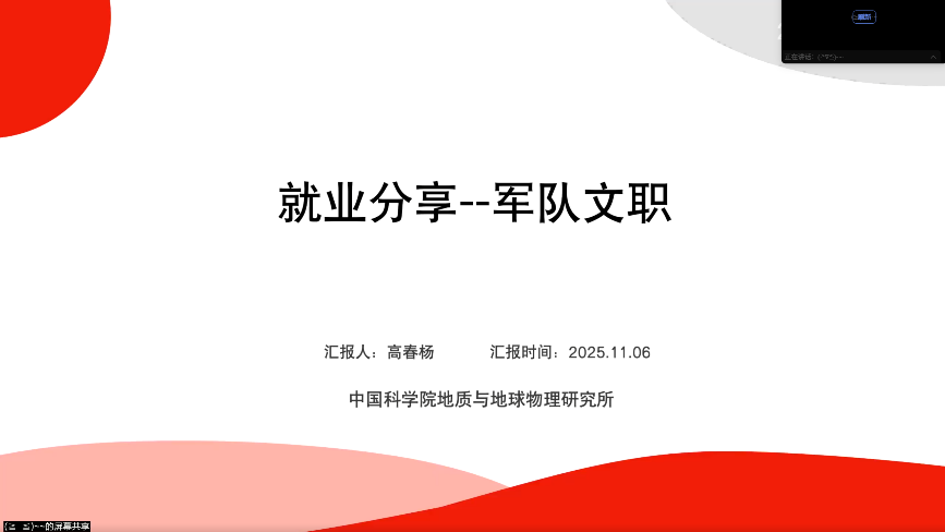 2025年11月6日,由中国科学院地质与地球物理研究所教育处、研究生会联合举办的第二期2026“筑梦职涯”就业系列活动正式启动。本次活动特邀在升学、就业等领域的优秀硕士、博士毕业生作为主讲嘉宾,以线上形式,分享宝贵的求职经验及提供职业规划建议。共计60余名研究生参加此次就业分享会活动。