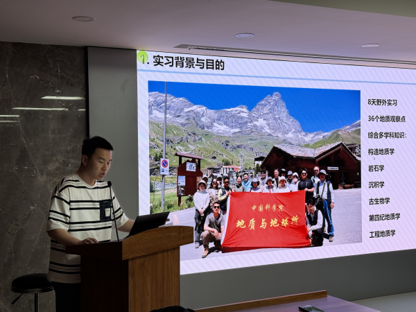 赵育龙同学以“阿尔卑斯山的地质启示——地质与地球物理研究所实习见闻”为题,分享了自己赴阿尔卑斯地区实习考察的经历。从专业视角出发,他介绍了当地典型地质现象,也结合实习过程中的见闻和体会,展示了科研与自然、人文交织在一起的独特魅力。